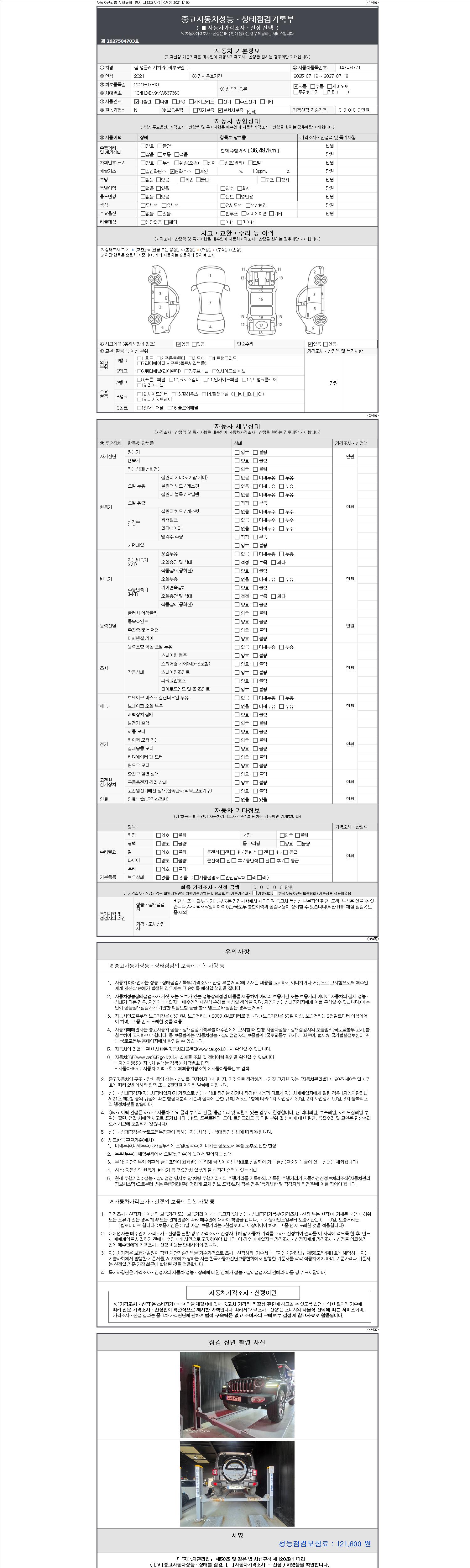 | 주행거리 | 36,497 km | 차량번호 | 147다6771 | 사고유무 | 성능기록부 참조 | 제시번호 | 제 2147483647 호 |