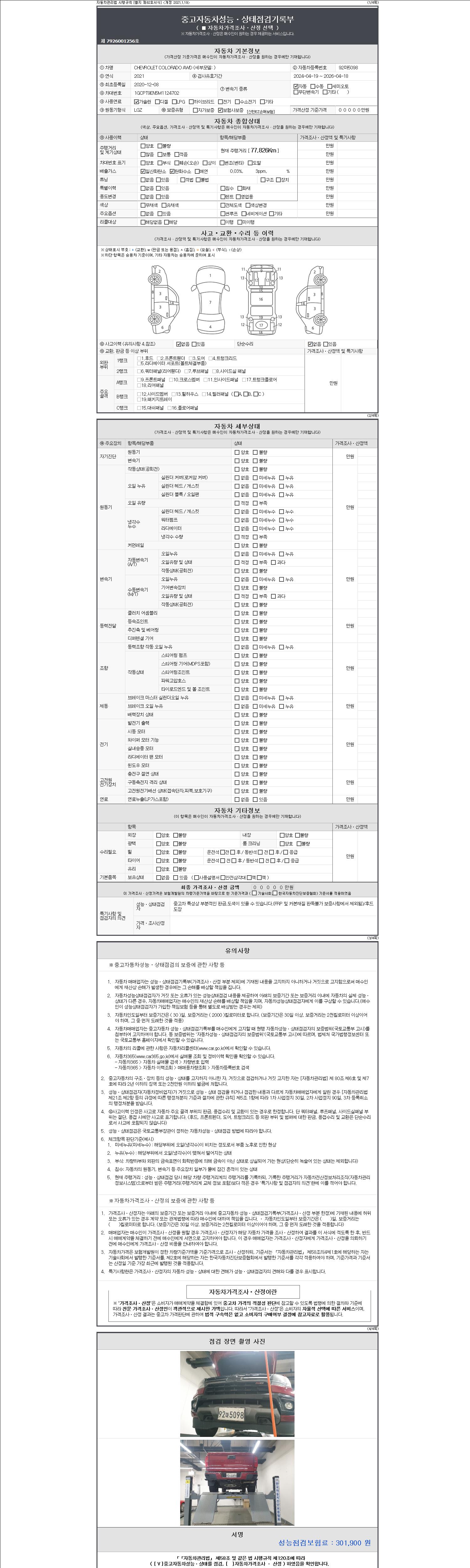자동차관리법 시행규칙 제120조의 규정에 따라 별지 제 82호서식 《중고자동차 성능, 상태점검 기록부》를 발행한 성능, 상태점검자 및 매매자는 아래의 보증기간 또는 보증거리 이내의 중고자동차, 성능점검 기록부에 기재된 내용과 자동차의 실제 성능, 상태가 다른 경우 계약 또는 관계법령에 따라 매수인에 대하여 책임을 집니다.