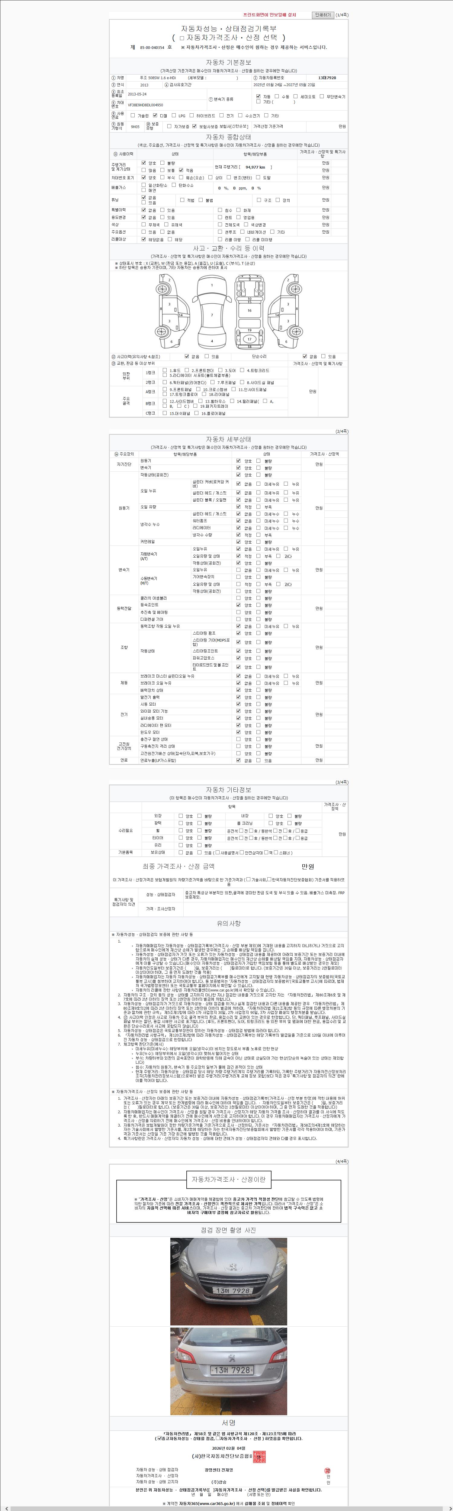 | 주행거리 | 94,977 km | 차량번호 | 13머7928 | 사고유무 | 성능기록부 참조 | 제시번호 | 제 2147483647 호 |