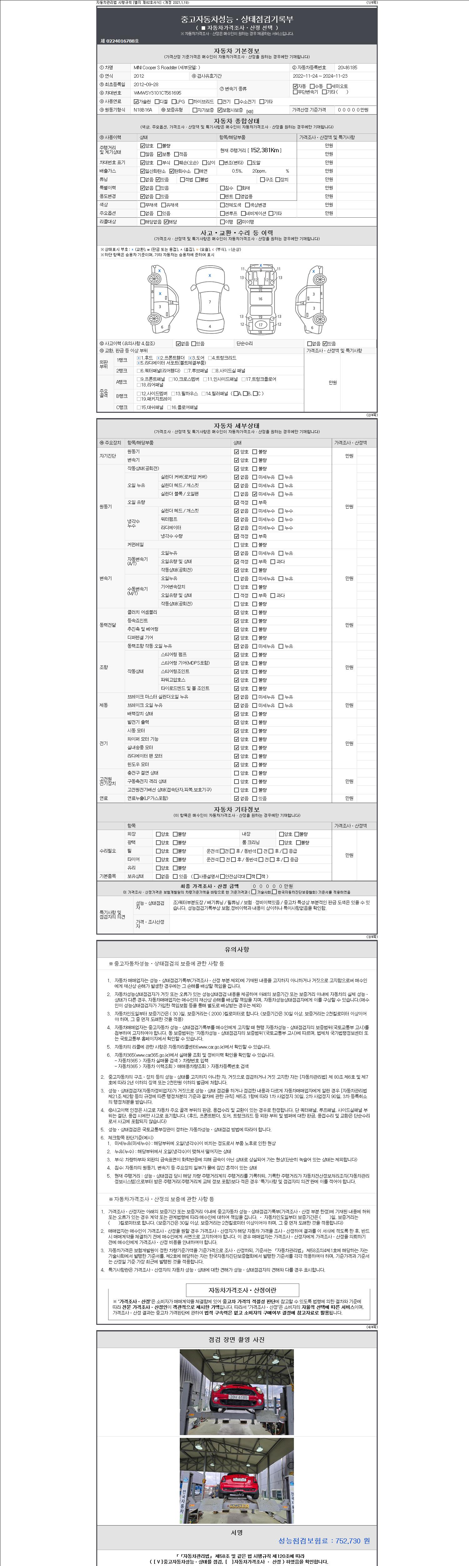 -중고자동차 매매업자를 통해 차량을 구입하실 경우 반드시 "중고자동차 성능, 상태점검 기록부"를 교뷰 받으셔야 하며, 매매업자는 반드시 의무 교부 하여야 압니다.