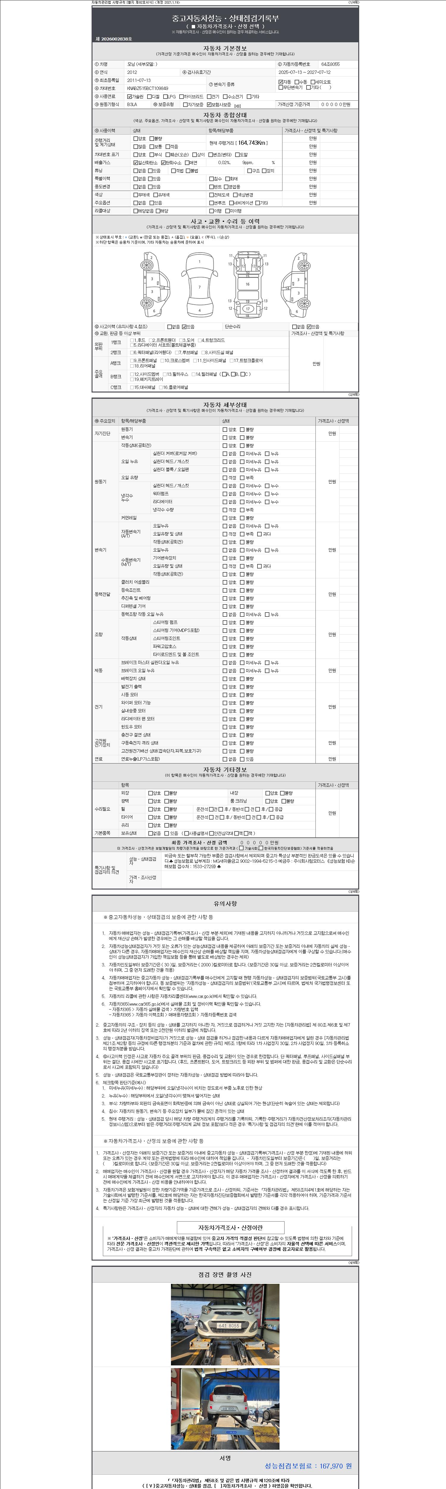 -중고자동차 매매업자를 통해 차량을 구입하실 경우 반드시 "중고자동차 성능, 상태점검 기록부"를 교뷰 받으셔야 하며, 매매업자는 반드시 의무 교부 하여야 압니다.