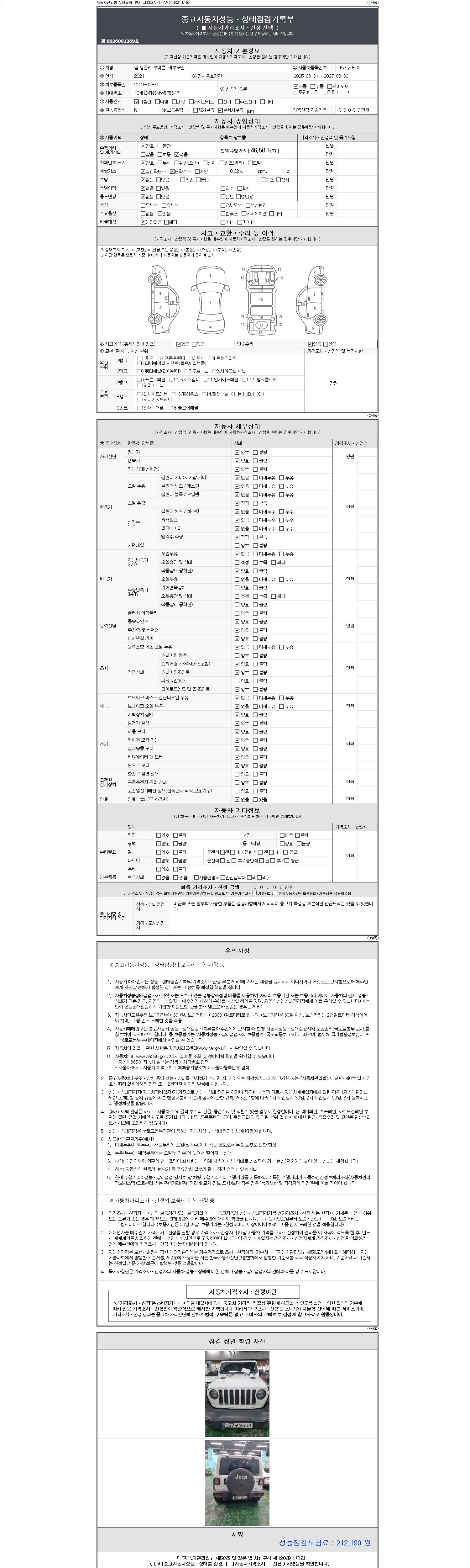 | 주행거리 | 46,501 km | 차량번호 | 157구9503 | 사고유무 | 성능기록부 참조 | 제시번호 | 제 2147483647 호 |