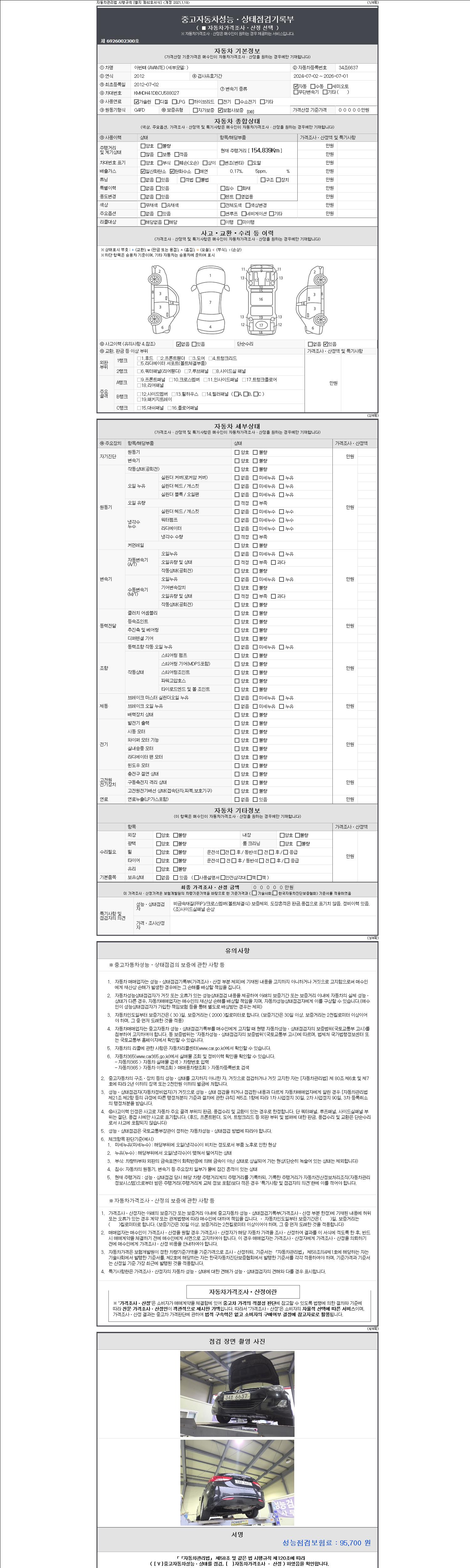 자동차관리법 시행규칙 제120조의 규정에 따라 별지 제 82호서식 《중고자동차 성능, 상태점검 기록부》를 발행한 성능, 상태점검자 및 매매자는 아래의 보증기간 또는 보증거리 이내의 중고자동차, 성능점검 기록부에 기재된 내용과 자동차의 실제 성능, 상태가 다른 경우 계약 또는 관계법령에 따라 매수인에 대하여 책임을 집니다.