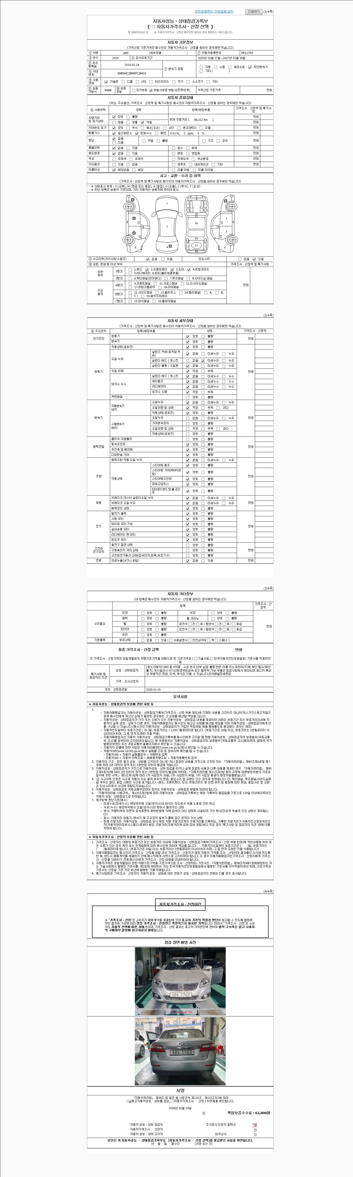 | 주행거리 | 86,294 km | 차량번호 | 58노1763 | 사고유무 | 성능기록부 참조 | 제시번호 | 제 2026013952 호 |