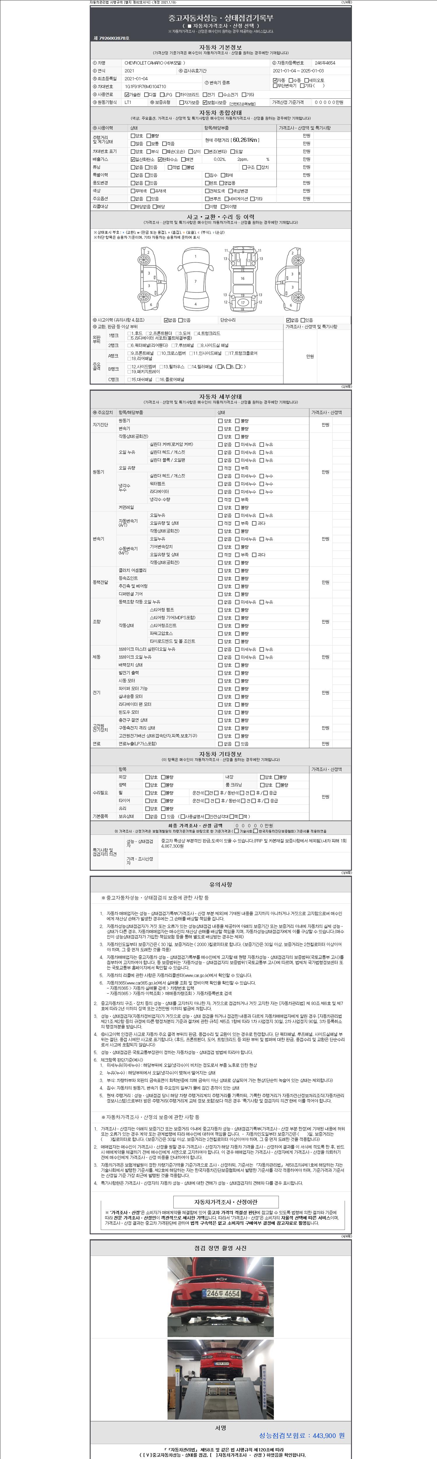 | 주행거리 | 60,261 km | 차량번호 | 246두4654 | 사고유무 | 성능기록부 참조 | 제시번호 | 제 2147483647 호 |