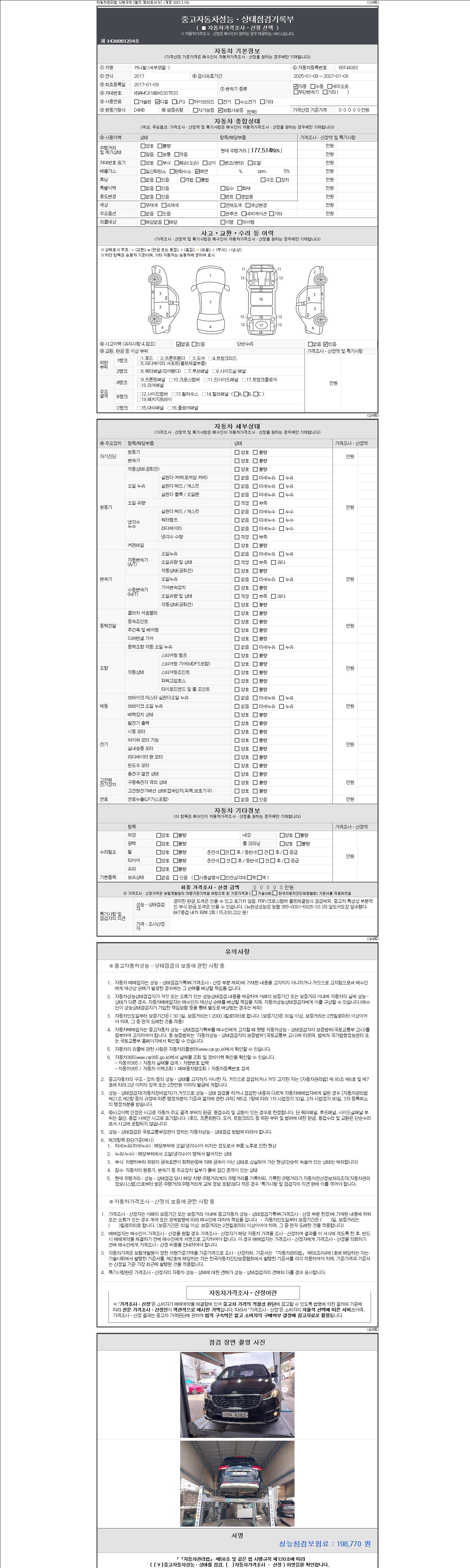 | 주행거리 | 177,514 km | 차량번호 | 65다4383 | 사고유무 | 성능기록부 참조 | 제시번호 | 제 2147483647 호 |