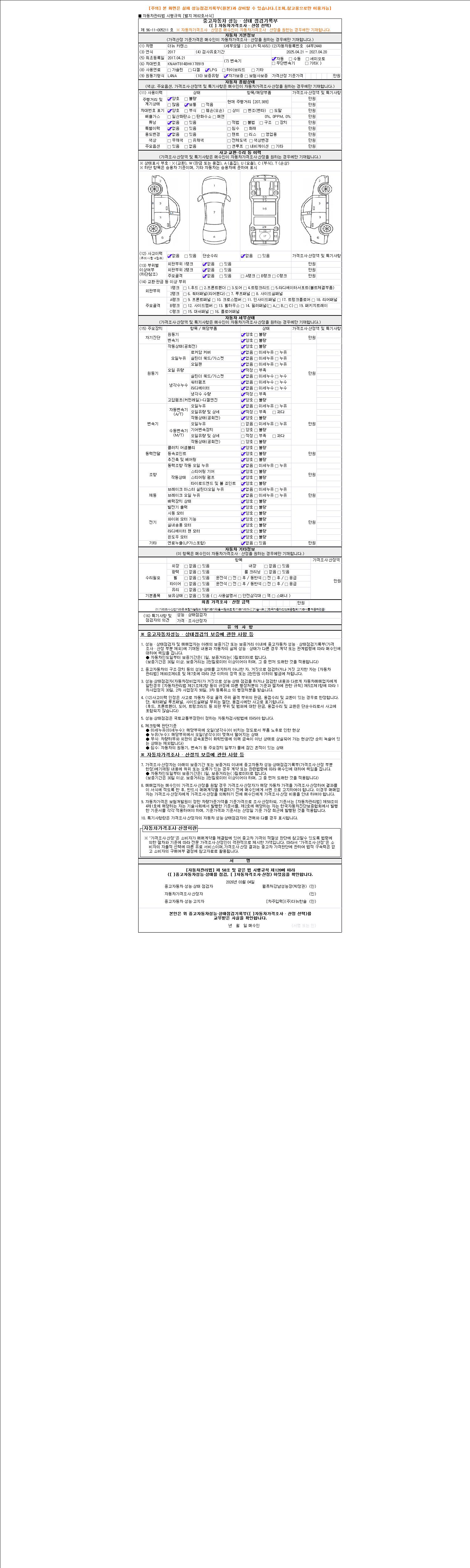 자동차관리법 시행규칙 제120조의 규정에 따라 별지 제 82호서식 《중고자동차 성능, 상태점검 기록부》를 발행한 성능, 상태점검자 및 매매자는 아래의 보증기간 또는 보증거리 이내의 중고자동차, 성능점검 기록부에 기재된 내용과 자동차의 실제 성능, 상태가 다른 경우 계약 또는 관계법령에 따라 매수인에 대하여 책임을 집니다.
