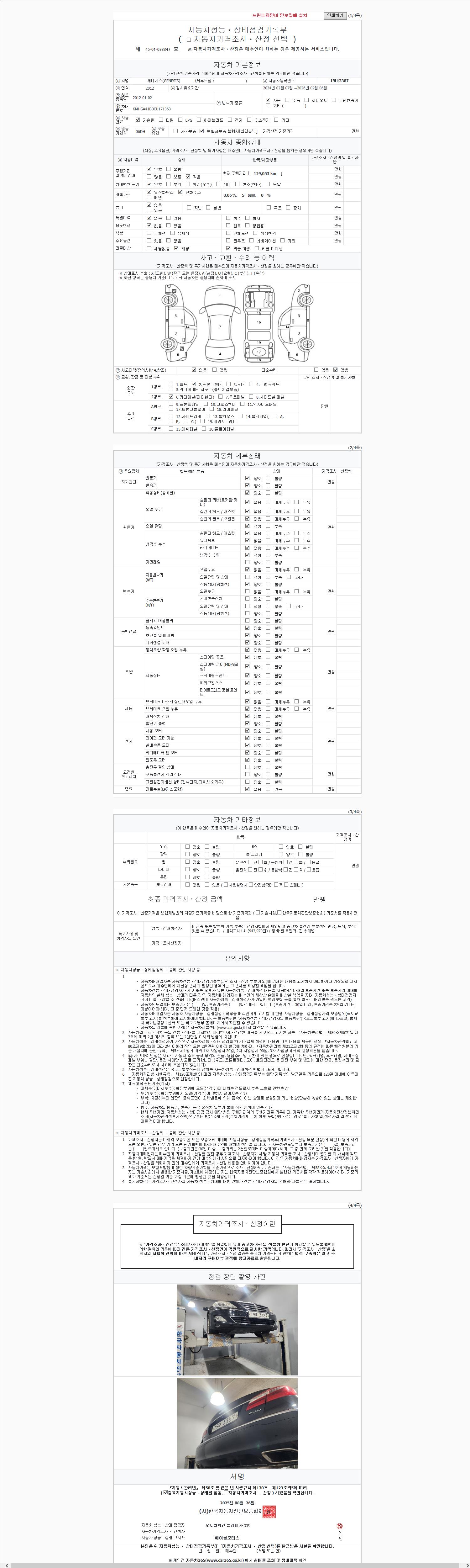 | 주행거리 | 129,053 km | 차량번호 | 19마3387 | 사고유무 | 성능기록부 참조 | 제시번호 | 제 2147483647 호 |