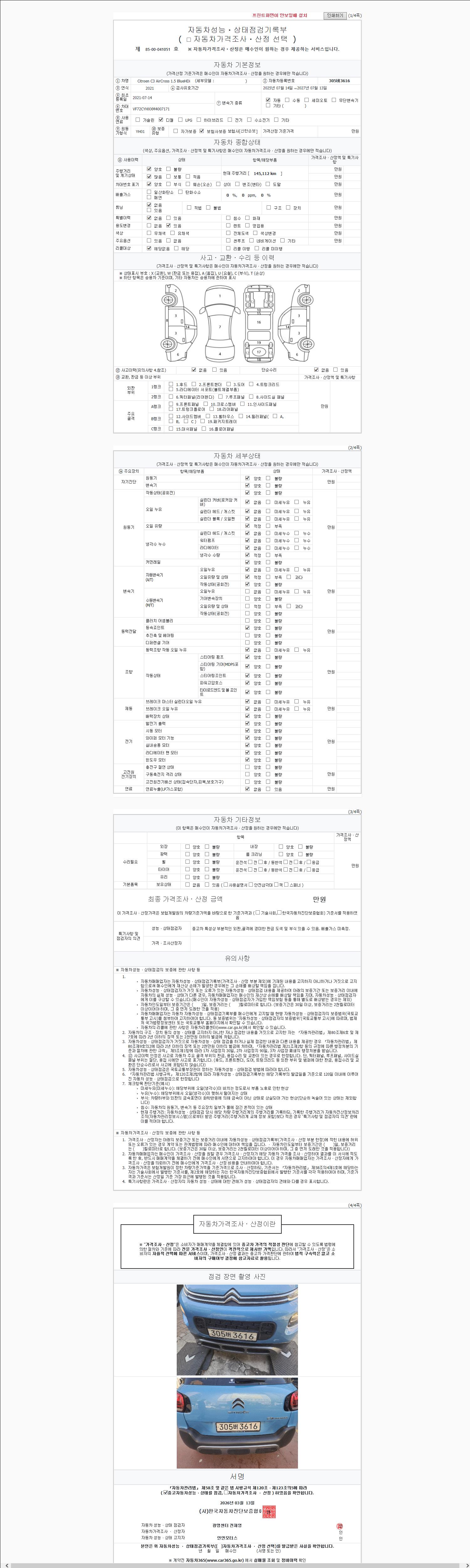 | 주행거리 | 145,112 km | 차량번호 | 305버3616 | 사고유무 | 성능기록부 참조 | 제시번호 | 제 2147483647 호 |